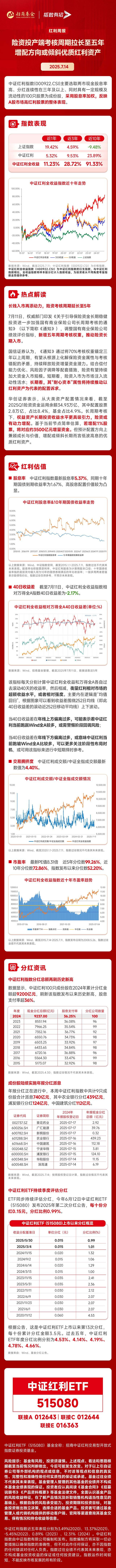 消息面上,高股息资产再迎政策助力。7月11日,权威部门印发《关于引导保险资金长期稳健投资进一步加强国有商业保险公司长周期考核的通知》(以下简称《通知》),调整国有商业保险公司绩效评价指标,新增五年周期考核权重,推动险资长期入市。