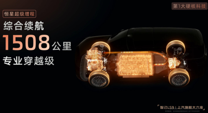 动力与底盘是智己LS9的核心竞争力,智己LS9搭载最新的“恒星”超级增程系统。1.5T增程器专注发电,最大功率为114千瓦,并配备前后双电机,最大功率分别为160千瓦和230千瓦。提供宁德时代52度和66度两种电池选择,CLTC 纯电续航里程最高为402km,满油满电综合续航超1500km。并且这套超级增程系统都可以加92号汽油,油电折合能耗为2.8L,彻底解决了用户的续航焦虑和用车成本顾虑。更值得一提的是,-20℃低温续航保持率达90%。800V碳化硅平台支持15分钟10%-80%快充,补能效率看齐纯电车型。