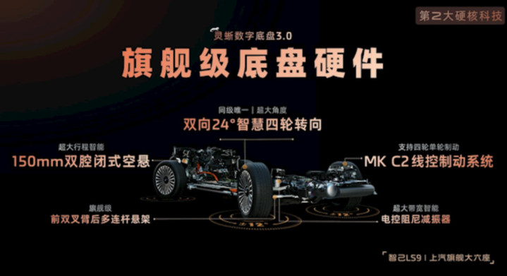 智己LS9还有个卖点就是搭载的灵蜥数字底盘3.0,其具备四轮转向系统让后轮最大偏转10度,5.2米车身掉头半径仅5米,尤其是在城区行驶,狭窄路况“一把过”,灵活性完全不输紧凑型轿车。还有闭式双腔空气悬架150mm行程,过减速带时车身起伏控制在5cm内,滤震表现接近“魔毯”效果,兼顾性能与舒适。