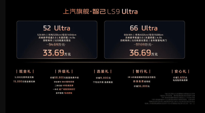 11月4日,智己汽车带来了年度压轴之作,首款大型六座SUV——智己LS9正式开启预售,共推出两个超级增程版本,全系皆Ultra:其中52 Ultra版,预售权益价33.69万元;66 Ultra版,预售权益价36.69万元。新车以长续航、四轮转向和全系标配激光雷达等硬核优势切入市场,竞争对手直指理想L9、问界M9等车型。